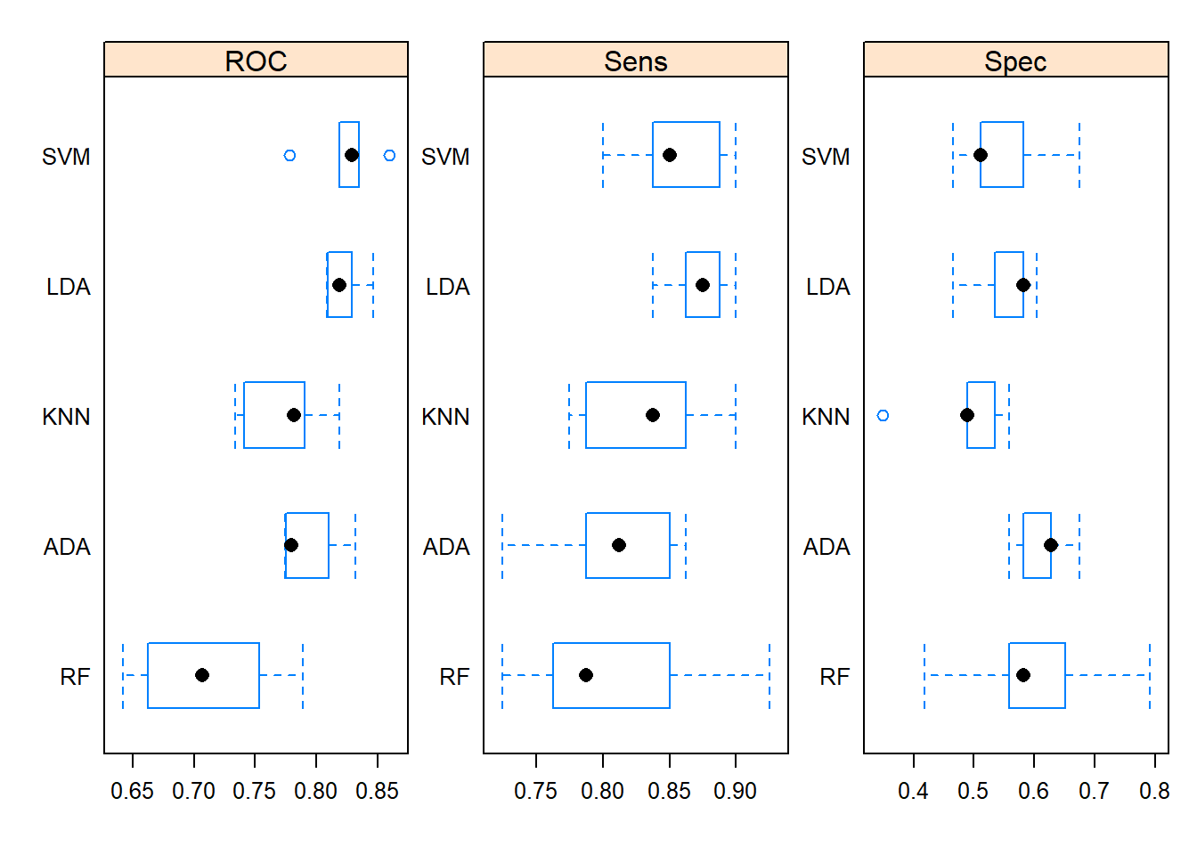 models_compare <- resamples(list(LDA=model1,KNN=model2,SVM=model3,RF=model4, ADA=model5))